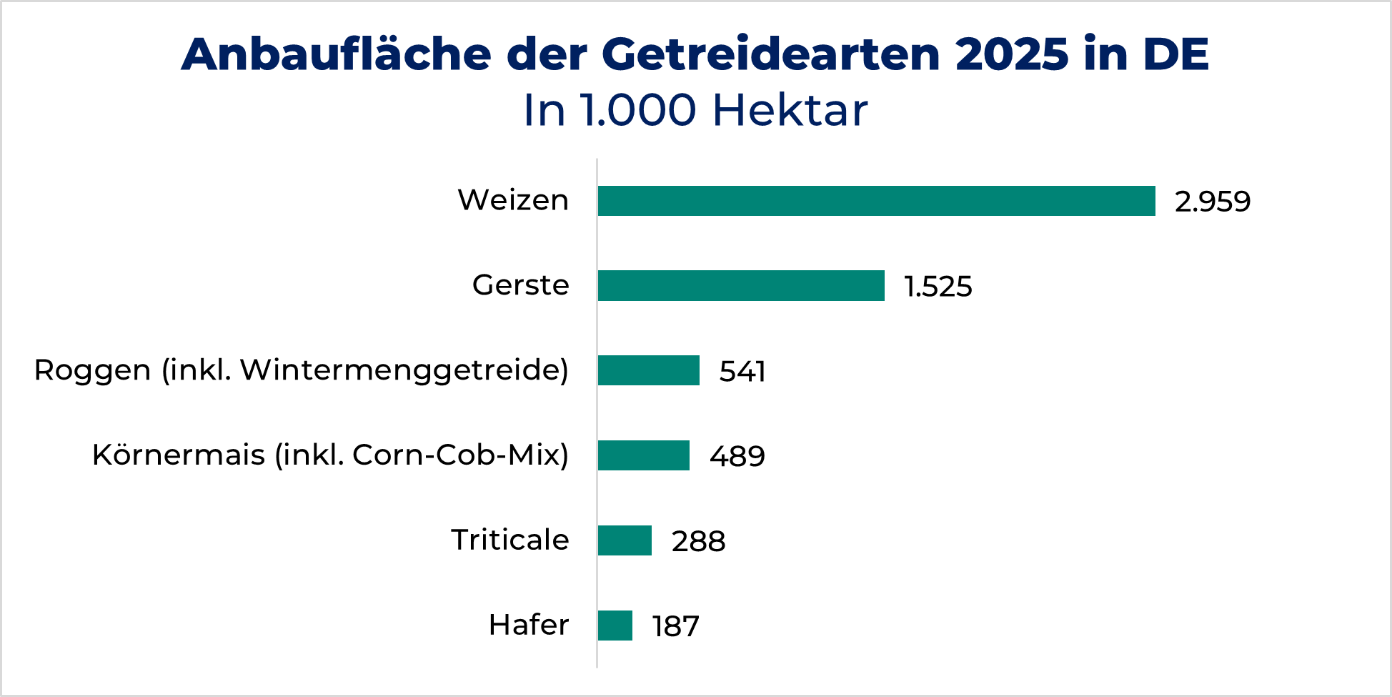 Neben fast 3 Millionen Hektar Weizen wurden ca. 1,5 Millionen Hektar Gerste, rund 540.000 Hektar Roggen inklusive Wintermenggetreide sowie knapp 500.000 Hektar Körnermais, 288.000 Hektar Triticale und 187.000 Hektar Hafer angebaut. Diese Zahlen verdeutlichen, dass Weizen mit Abstand die bedeutendste Getreidekultur in Deutschland darstellt, wohingegen die „Gesundungsfrucht“ Hafer eher ein Nischendasein führt, die Anbaufläche aber im Laufe der letzten Jahre in der Tendenz zunehmend ist. Bei Winterroggen inkl. Wintermenggetreide blieb die Anbaufläche in etwa gleich, konnte jedoch nicht an den Umfang der vorangegangenen Jahre anknüpfen, die Wintergerstenanbaufläche nahm im Vergleich zu 2024 um 7,4 % ab, Körnermais auch leicht abnehmend, jedoch mehr als in den Vorjahren und Triticale mit einer Zunahme von rund 8 %, dennoch weniger als in den Vorjahren.
