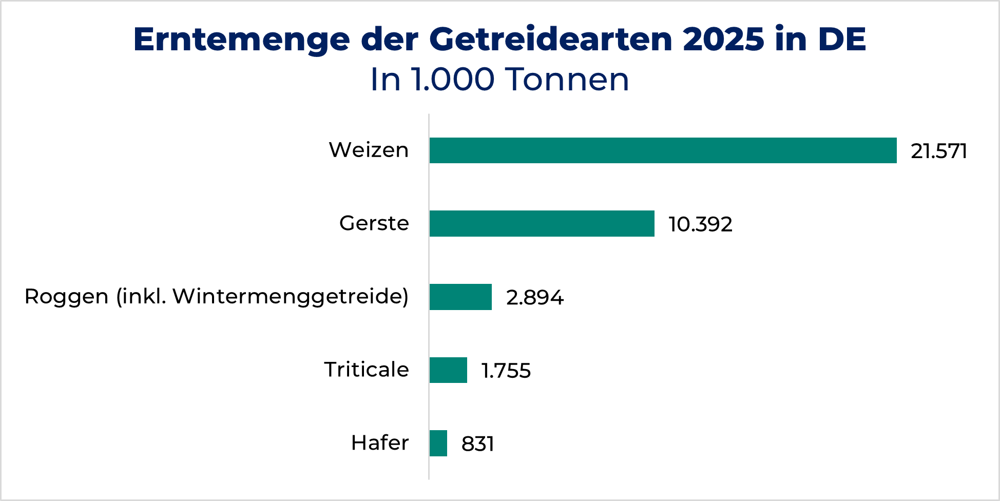 Nachfolgende Grafik zeigt die Erntemengen der bisher geernteten Getreidearten 2025 in Deutschland. Weizen zeigt sich hierbei mit 21,5 Mio Tonnen Erntemenge an der Spitze, Gerste rangiert mit knapp 10,4 Mio Tonnen, wovon 1,7 Mio Tonnen Sommergerste und 8,7 Mio Tonnen Wintergerste waren, dahinter. Es folgen Winterroggen inkl. Wintermenggetreide (2,9 Mio Tonnen), Triticale (1,75 Mio Tonnen) und Hafer (831.000 Tonnen).