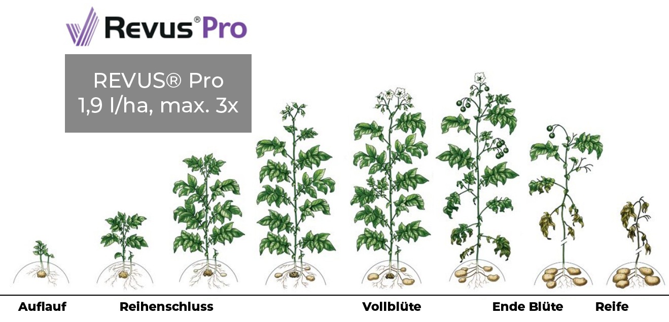 Versuche der TU München-Weihenstephan aus 2024 haben bewiesen, dass REVUS Pro eine sehr gute Wirkung gegen den primären Stängelbefall aufweist und somit prädestiniert ist zur Anwendung gegen den latenten Befall von Phytophthora infestans im Spritzstart.