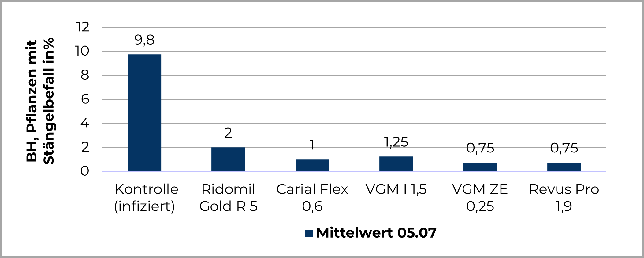 Abbildung 1: REVUS Pro im Vergleich gegen primären Stängelbefall – Doppelknollenmethode (TU München Weihenstephan 2024)