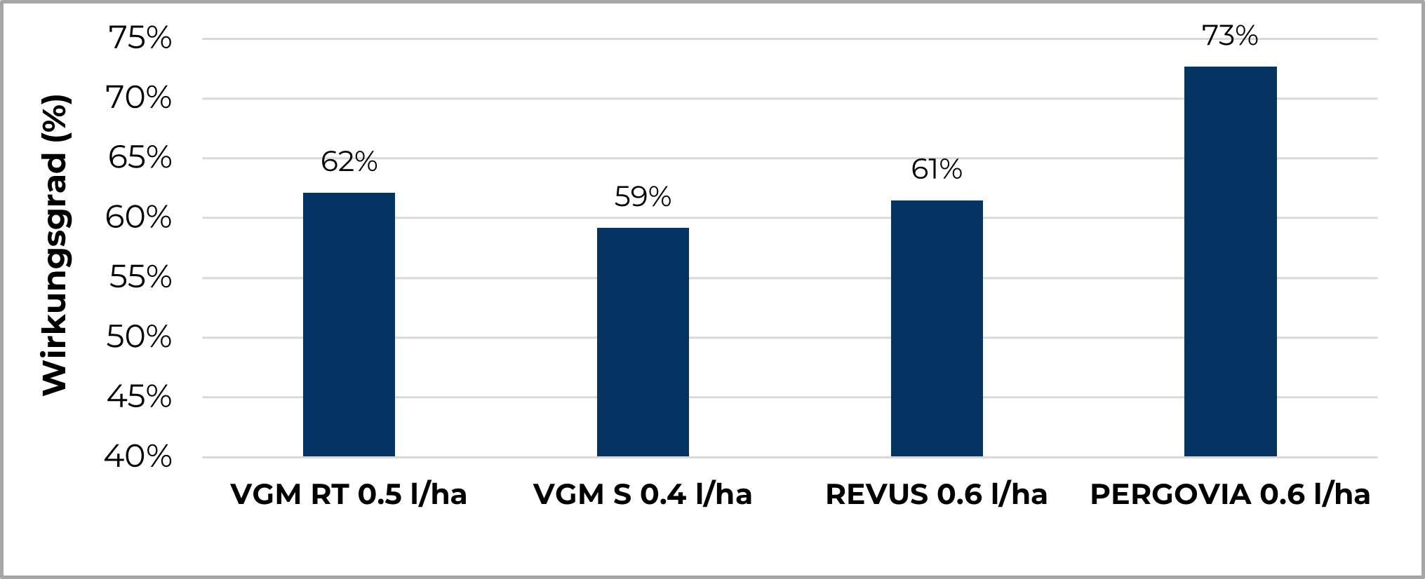Europäische Entwicklungsversuche aus 2023 bestätigen die gute Wirkung von der Fertigmischung PERGOVIA im Vergleich zu den jeweiligen Solo-Wirkstoffen.