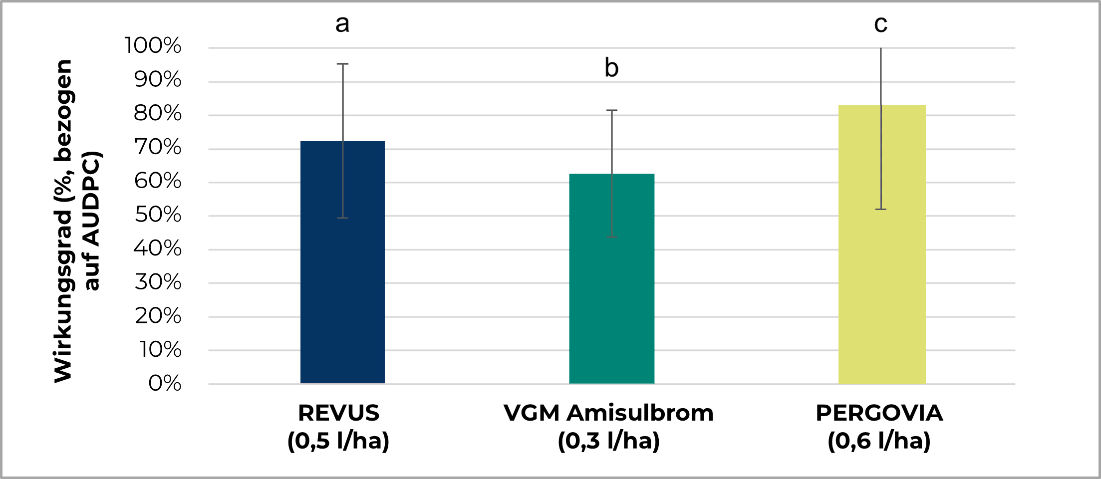 Abbildung 3: Wirkungsgrad von PERGOVIA gegen Phytophthora infestans gegenüber den Solo-Wirkstoffen REVUS und Amisulbrom (Mittelwert von 18 europ. Versuchen gegen aus 2023)