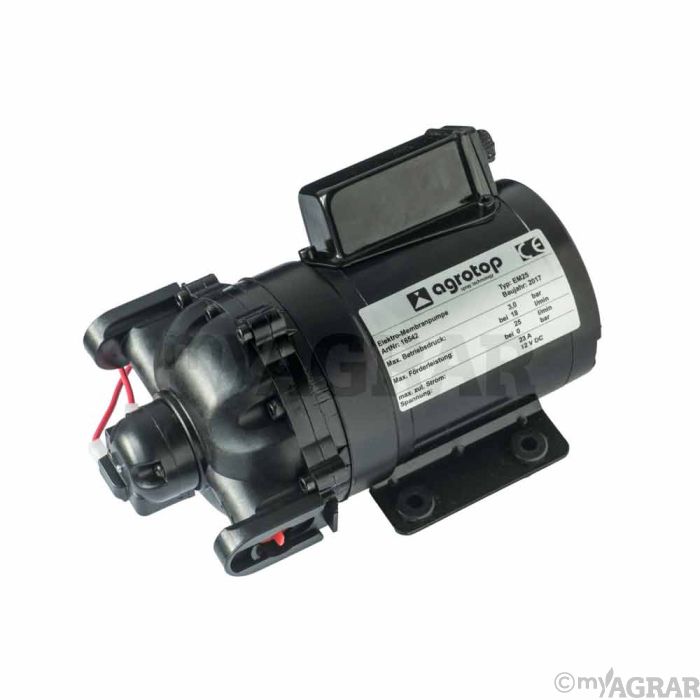 Die Agrotop Membran-Pumpe EM hat drei Membrane (aus EPDM) und ist an einen 12-Volt-DC-Motor geflansht. Durch die geringe Baugröße und die robuste Konstruktion der Pumpe lässt sich diese hervorragend z.B. in kleinen tragbaren Spritzengeräten und engen Bereichen für Sonderanwendungen einsetzen. Diese Elektro-Kleinpumpe ist mit einem Druckschalter ausgestattet, der bei Überdruck die Pumpe abschaltet.