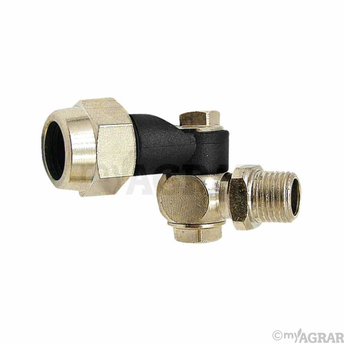 Ein Drehgelenk (in einer Ebene schwenkbar, Anschlussgewinde = 1/4",Außengewinde = 3/8", Länge = 35 mm, Polyamid, bis max. 20 bar, für alle Düsen bis 11 mm, Universal System) von ARAG.