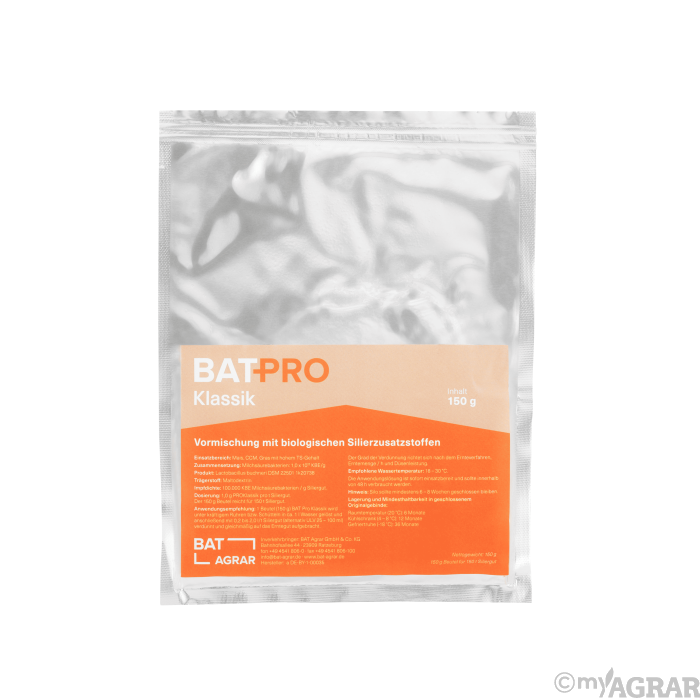 BAT ProKlassik ist ein Siliermittel, welches sich besonders für normale bzw. trockene Grassilagen, GPS und Mais empfiehlt. Das Mittel mit der DLG geprüften Zusammensetzung sorgt nachweislich für eine verbesserte Stabilität und enthält keine Enzyme. Des Weiteren trägt auch der bekannte enthaltene Lactobacillus Buchneri durch die schnelle Bildung von Essigsäure zur Stabilisierung von fast jeder Art von Silage bei. Die gebildete Essigsäure verfügt wiederum über eine antagonistische Wirkung gegenüber Hefen und stoppt somit ihre Vermehrung. Der pH-Wert bleibt zudem auf einem dauerhaft tiefen Niveau und garantiert so einen Schutz vor Verderb und Schimmel.