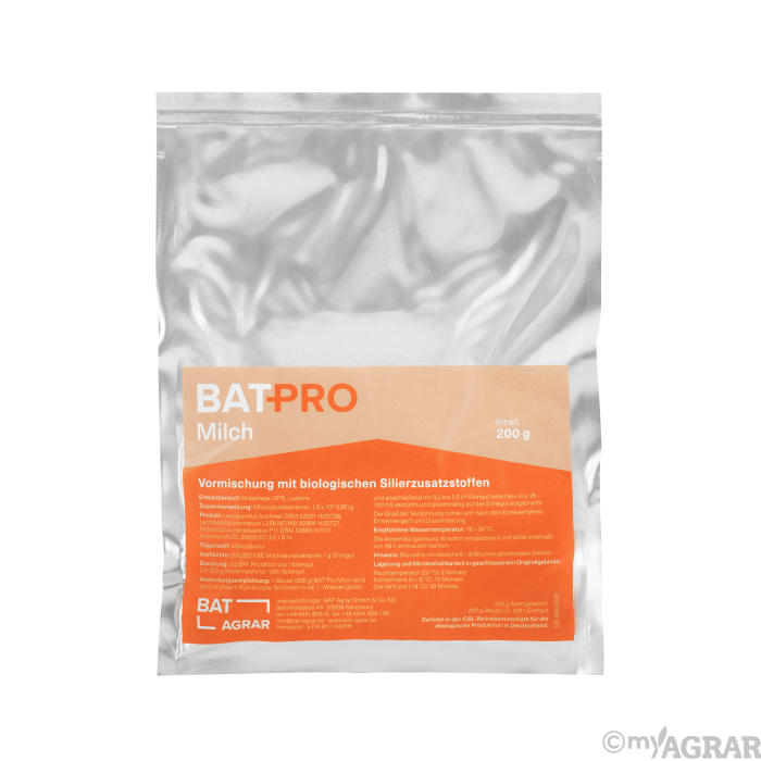 BAT ProMilch ist ein Siliermittel, welches universell bei Luzerne, Grünroggen und (feuchterer) Grassilage empfohlen wird. Mit dieser Mischung an biologischen Silierzusatzstoffen wird eine schnelle Absenkung des pH-Wertes und somit eine bessere Verdaulichkeit erreicht. Die Kombination von langjährig in Europa erprobten und bewährten Bakterien und Enzymen, bringt einen 5-phasigen Silierprozess mit sich. Somit gelingt die Silierung von fast jedem Ausgangsmaterial. Die Wirkung der Kombination der enthaltenen Bakterien und Enzymen wurde in Studien der LWK Schleswig-Holstein bestätigt.