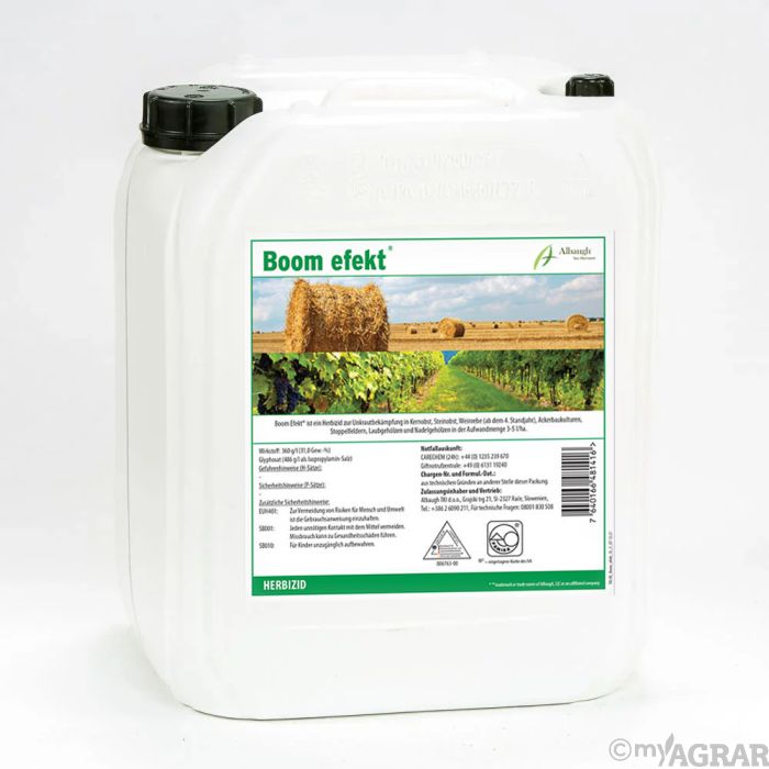 Boom efekt ist ein nicht selektives Herbizid zur Bekämpfung von Unkraut in Ackerbaukulturen, Laubgehölzen, Nadelgehölzen, Kernobst, Steinobst und Weinreben (Ab 4. Standjahr). Die Aufwandmenge beträgt 3-5 l/ha. Durch die systemische Wirkung wird der Wirkstoff Glyphosat in der gesamten Pflanze verteilt und nach ungefähr 7-10 Tagen tritt, bei einer normalwüchsigen Witterung, eine sichtbare Wirkung an den Pflanzen ein.
