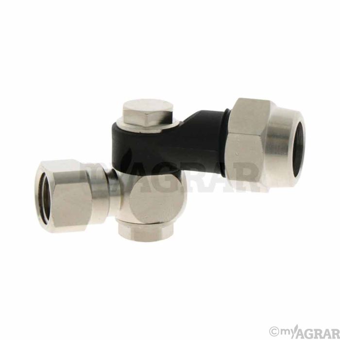 Ein Drehgelenk (in einer Ebene verstellbar, Innengewinde 1/4", Außengewinde 3/8", Länge 35 mm, Polyamid, bis max. 20 bar, Universal System) von Braglia.