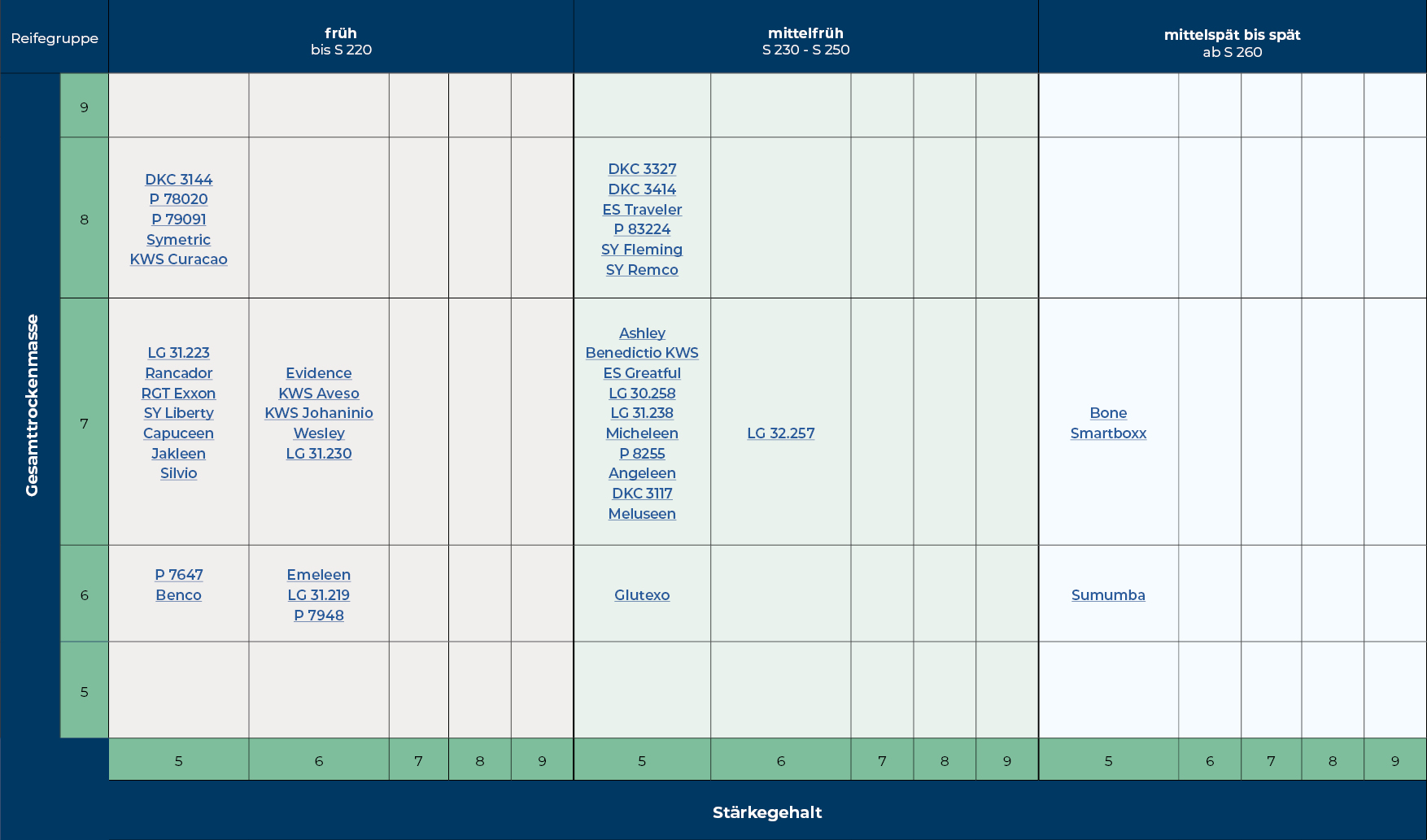 Einstufung der Silomaisssorten auf Basis der Gesamttrockenmasse und des Stärkegehaltes.