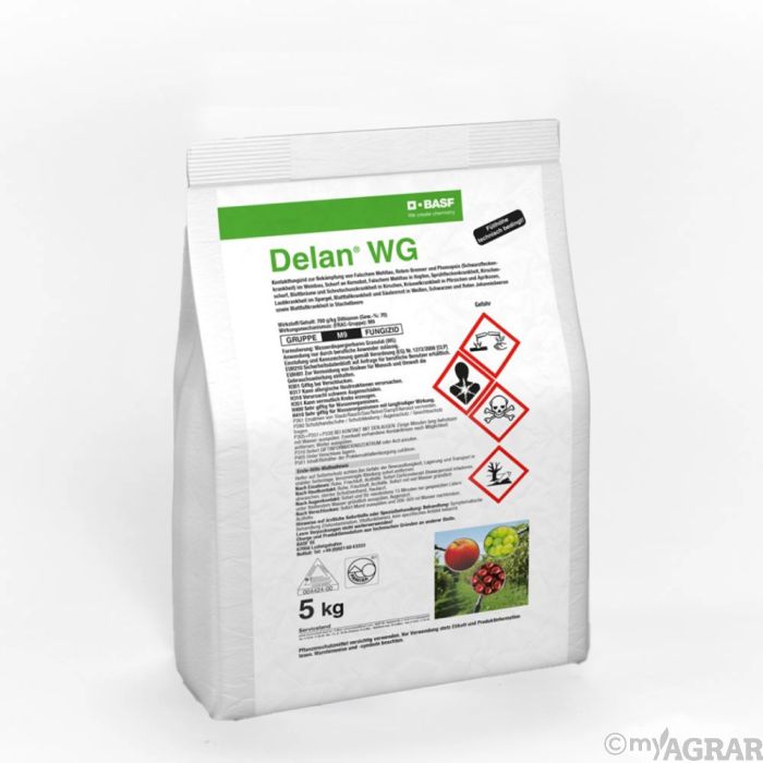Delan WG ist ein Kontaktfungizid zur Bekämpfung von Pilzkrankheiten in Gemüse, Hopfen, Wein und Obst. Es besitzt eine umfassende Wirkung gegen zahlreiche Pilzkrankheiten. Delan WG dient zum vorbeugenden Einsatz, die Sporenkeimung wird unterbunden. Wirkstoffdepots haften stabil und gleichmäßig an den Pflanzen und bilden einen regenfesten Spritzbelag. Diese Wirkstoffdepots werden durch Niederschläge und Tau immer wieder aktiviert und gewährleisten einen sicheren Langzeitschutz.