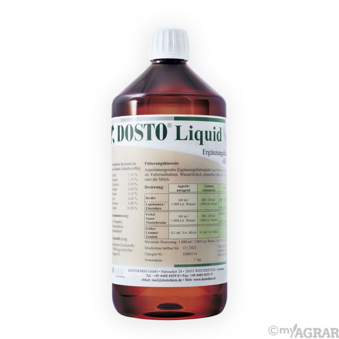 DOSTO Liquid ist ein wasserlösliches Ergänzungsfuttermittel für Geflügel, Schweine, Kälber, Lämmer und Kaninchen, welches zur Vorbeugung von Gesundheitsproblemen und Leistungsdepressionen sowie zur Stabilisierung der Magen- und Darmfunktion beiträgt. Das Mittel ist flexibel im Einsatz und bietet eine schnelle Wirkung. Des Weiteren dient es zur Verwendung in Stressphasen wie etwa bei der Ein- und Umstellung von Tieren, bei einem Futterwechsel oder auch bei extremen Wettersituationen. Außerdem trägt es zu einer verbesserten Futter- und Wasseraufnahme bei. Dabei kann DOSTO Liquid über das Trinkwasser oder die Milch verabreicht werden, gilt als äußerst schmackhaft und appetitanregend und ist rein natürlich und hochwirksam.