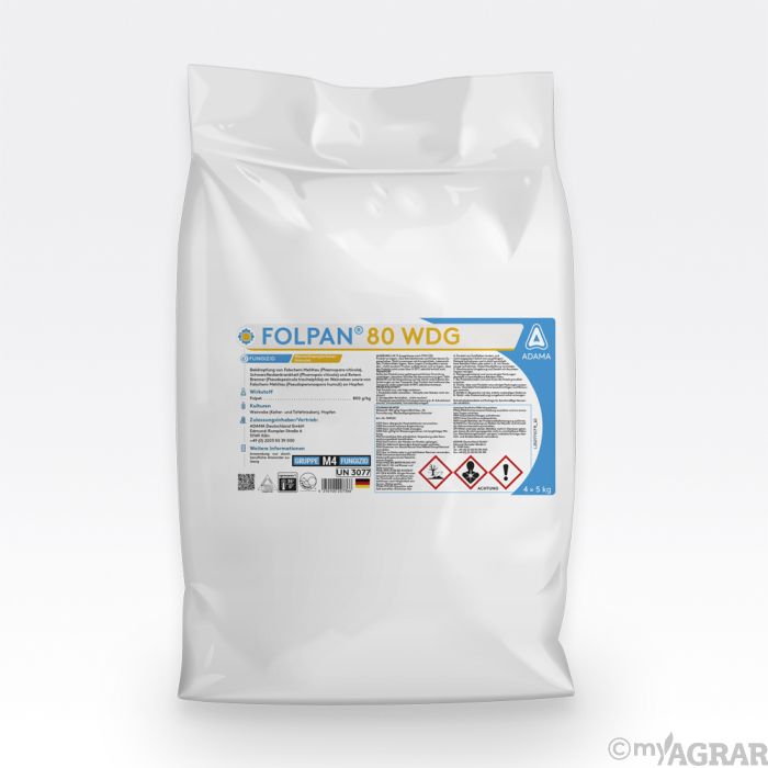 Beim Produkt Folpan 80 WDG handelt es sich um ein Kontaktfungizid, welches protektiv an Weinreben gegen Roten Brenner, Falschen Mehltau und Schwarzfleckenkrankheit, sowie an Hopfen gegen Falschen Mehltau, wirkt. Durch die Anwendung von Folpan 80 WDG wird ein oberflächenaktiver Belag auf der Pflanze gebildet, der den Pilz schon an einer Auskeimung stoppt. Durch die protektive Wirkung des Pflanzenschutzmittels sollte die Anwendung vor oder spätestens zu Infektionsbeginn erfolgen und kann bei Bedarfsfall wiederholt werden.
