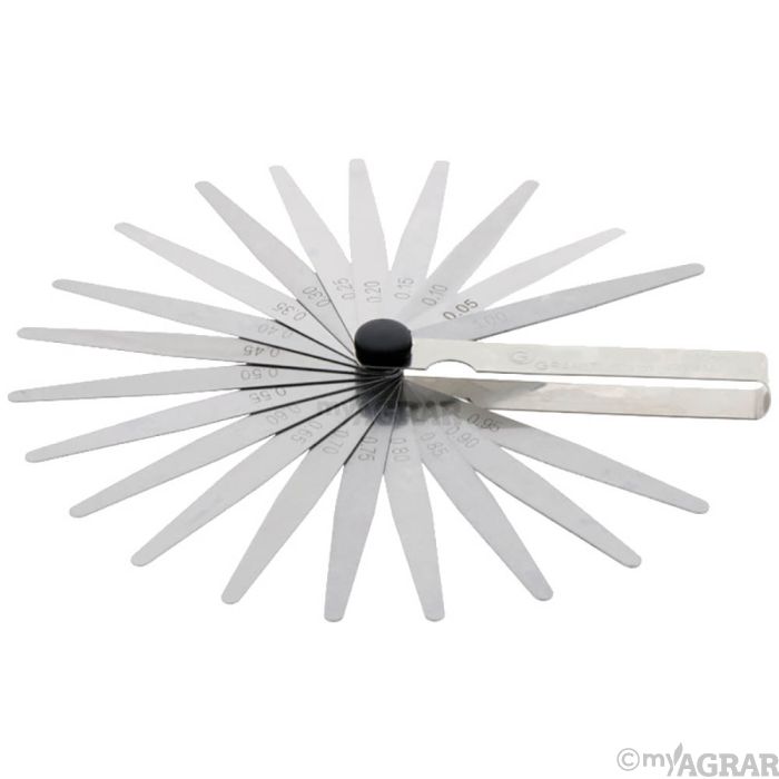 zum Prüfen von Zwischenräumen, Kontaktabständen, etc. Fühlerlehre konisch zulaufend mit Feststellmutter Blätter einzeln mit Größenangabe beschriftet Blätter aus gehärtetem Federstahl inklusive einer antimagnetischen Fühlerlehre Messbereich: 0,05 - 1,00 mm 20 Blätter
