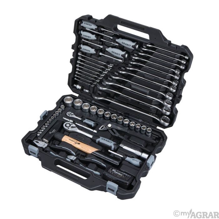 1/4"" Vierkant-Schraubendreher, 150 mm 1/4"" Umschaltknarre- 1/2"" Umschaltknarre 1/4"" Sechskant-Stecknuss, 4- 4,5- 5- 5,5- 6- 7- 8- 9- 10- 11- 12- 13 mm 1/2"" Sechskant-Stecknuss, 14- 15- 16- 17- 18- 19- 20- 21- 22- 24- 27- 30- 32 mm 1/4"" Verlängerung,50 mm,100 mm 1/2"" Verlängerung, 125 mm 1/2"" Bit-Adapter-Stecknuss, 1/2"" x 5/16"", 38 mm 1/4"" Vergrößerungsadapter, 1/4""Fx3/8""M Ringmaulschlüssel, abgewinkelt, 6- 7- 8- 9- 10- 11- 12- 13- 14- 15- 16- 17- 18- 19- 22- 24- 27- 30- 32 mm Schraubendreher mit Schlagkappe: PH1- PH2, Schlitz: 4- 5,5- 6,5 mm 1/4"" Bit-Satz, 32-tlg. Wasserpumpenzange Schnellverstellung, 250 mm Kombinationszange, 180 mm Seitenschneider, 160 mm Schlosserhammer 500 g