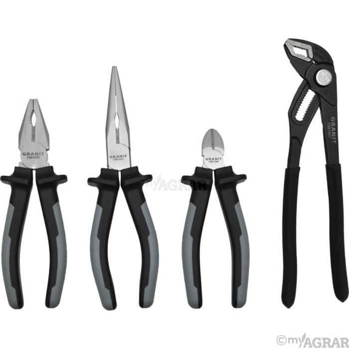 1x Wasserpumpenzange 250 mm 1x Flachrundzange 200 mm 1x Kombinationszange 180 mm 1x Seitenschneider 160 mm