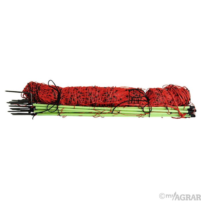 Für Schafe, Lämmer, Ziegen, 90 cm hoch, 50 m lang, 8 horizontale Kunststofflitzen, davon 7 mit eingearbeitetem Chromnickeldraht. Bodenlitze verstärkt, nicht stromführend. 14 Pfähle mit Doppelspitze. Jeder Maschenkreuzungspunkt mit Kunststoffplombe unlösbar verschweißt. Obere Litze extra stark, 6 Edelstahldrähte Ø 0,20 mm, 24 Kunststoffmonofile Ø 0,40 mm