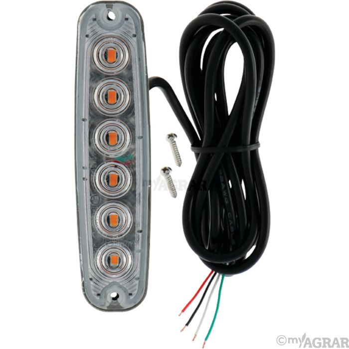 LED-Frontblitzleuchte mit 6 SMD-LEDs mit gelbem Licht für senkrechten Anbau. Aluminiumgehäuse mit klarer Kunststoff- Lichtscheibe. Einfache Montage Lochabstand 120 mm mit Ø 4 mm Bohrung. Eine Blitzleuchte mit Funktionswechsel für simultanen oder wechselnden Blitz. Anschlusskabel 2500 mm lang mit offenen Enden.