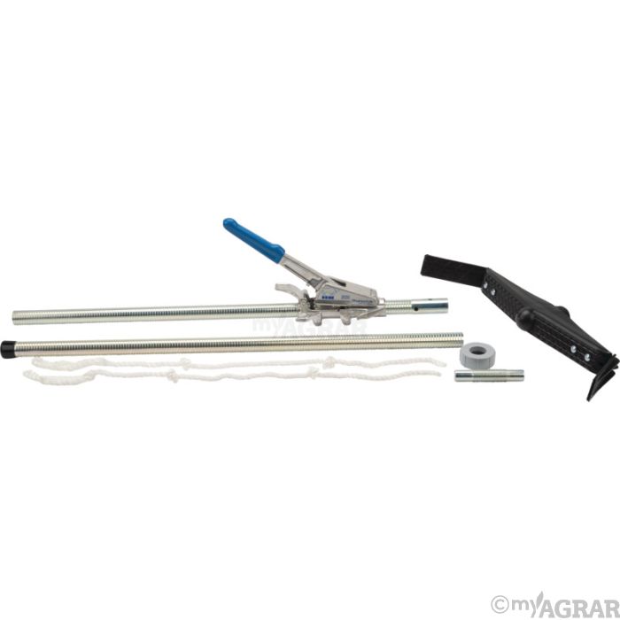 Modell E11 mit Seitenwinkel bestens bewährt bei der Geburtshilfe an Großtieren, vor allem bei Rindern rundes, verzinktes Stahlrohr, grob gewindet 180 cm lang, 1-teilig Spannmechanik aus Alu, schnell lösbare Zugkraftkorrektur mit 3 Haken ausgerüstet Ansatzstütze aus Kunststoff