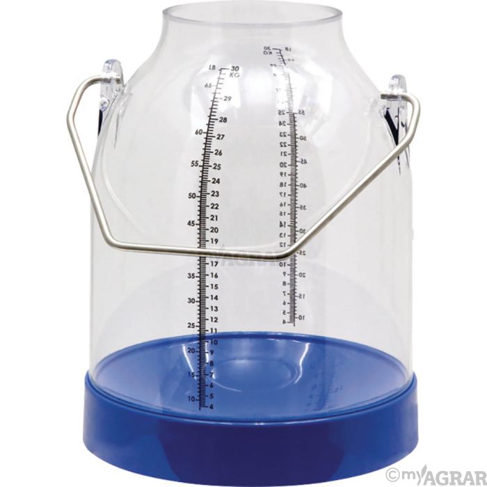 Kunststoff (Polycarbonat) lebensmittelecht mit doppelter Skala (KG und LB) Fassungsvermögen 30 Liter mit Metall-Tragebügel für den täglichen Gebrauch ermöglicht eine Überprüfung der Milchleistung jeder einzelnen Kuh auch für fahrbare Melkanlagen passend für Anlagen gängiger Markenhersteller (z.B. Westfalia) Bügelhöhe 143 mm