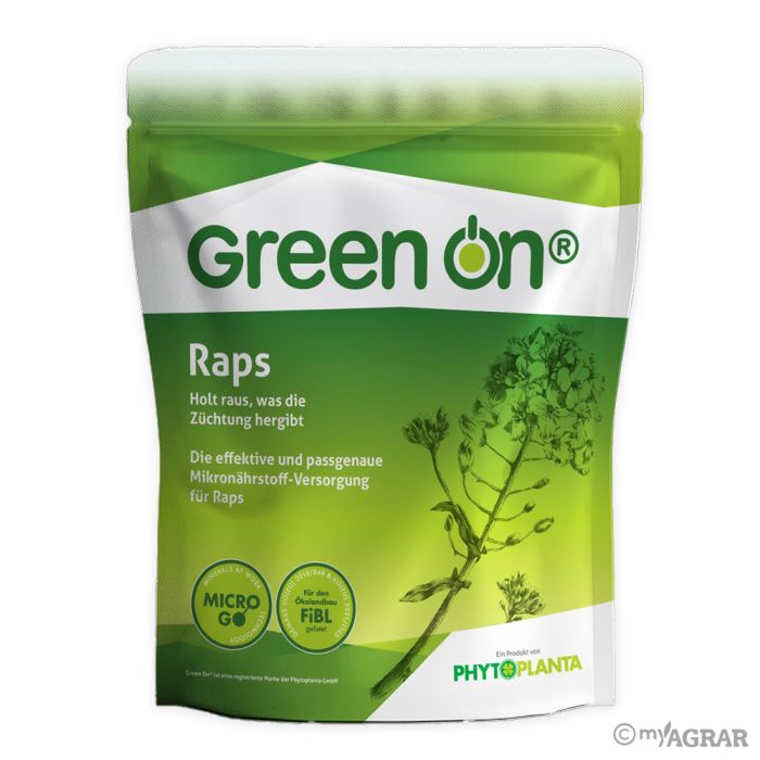 Green On® Raps ist ein Mehrnährstoff Blattdünger, in dem die Spurenelemente Mangan und Kupfer mit der Aminosäure Glycin zu hochwirksamen Molekülen chelatisiert sind. Diese stabilen MicroGo-Chelate ermöglichen mit dem ebenfalls vollständig wasserlöslichen Bor eine 2-in-1-Wirkung: optimierte Pflanzenernährung und Wachstumsstimulierung für mehr Ertrag und Qualität. Green On® Raps ist die anwenderfreundliche Lösung, um Versorgungslücken während kritischer Wachstumsphasen zu verhindern. Das Produkt kann vorzüglich in Tankmischung mit Insektiziden zur Käferbehandlung (BBCH 31-49) angewandt werden, um Versorgungslücken während der Streckungsphase mit der Ausdifferenzierung der Seitentriebe und Knospenanlage bestmöglich zu vermeiden. Die volle Wirkung der Insektizide bleibt unter gleichzeitiger Optimierung der Mikronährstoffversorgung gewahrt. Das in dieser Phase verabreichte Bor trägt bereits zu einem verbesserten Schotenansatz bei. Eine weitere Applikation bis kurz vor Blühbeginn stärkt durch den stoffwechselaktivierenden Glycin-, Stickstoff- und Schwefel-Effekt den Energiehaushalt der Rapspflanze und ermöglicht dadurch eine längere Blühphase mit einem vermehrten Schotenansatz.