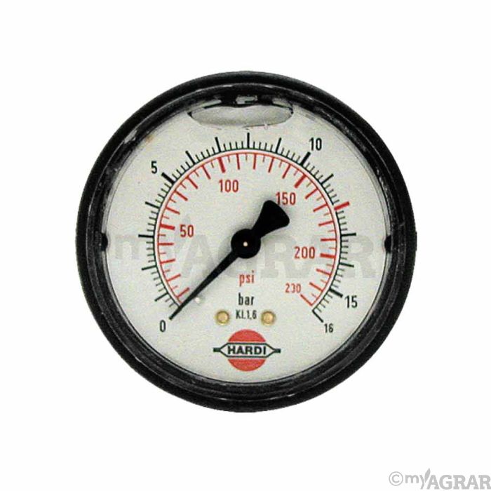 Ein Glycerinmanometer (Anschluss hinten 1/4", 0-16 bar, Ø 65 mm) von Hardi.