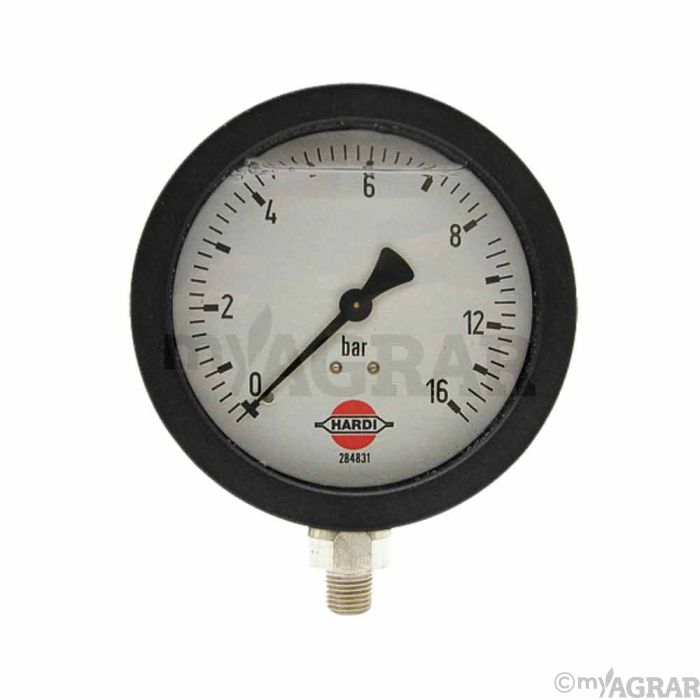 Ein Glycerinmanometer (Anschluss unten 1/4", 0-16 bar, Ø 100 mm) von Hardi.