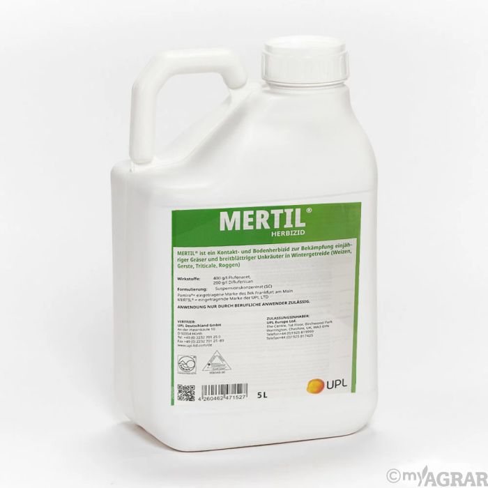 Mertil ist ein Kontakt- und Bodenherbizid zur Anwendung im Nachauflauf. Das Pflanzenschutzmittel bekämpft im Wintergetreide einjährige Gräser und breitblättrige Unkräuter. Mertil bekämpft den Ackerfuchsschwanz nachhaltig.