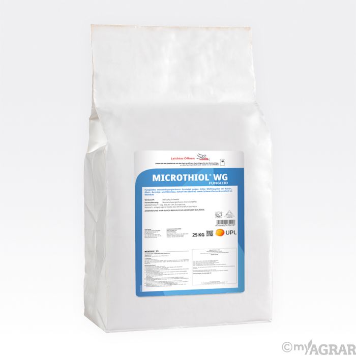 Microthiol WG ist ein Fungizid zur Bekämpfung von Echtem Mehltau in Acker-, Gemüse-, Obst- und Weinbau. Microthiol WG ist ein biologischer Netzschwefel, welcher im Spritz- und Spühverfahren eingesetzt werden kann. Durch die Anwendung erfolgt der Aufbau eines Schutzbelages auf der Blattoberfläche, wodurch die Sporenkeimung bei Echtem Mehltau verhindert wird. Der Netzschwefel wirkt protektiv und muss aus diesem Grund vor oder spätestens bei Befallsbeginn eingesetzt werden.