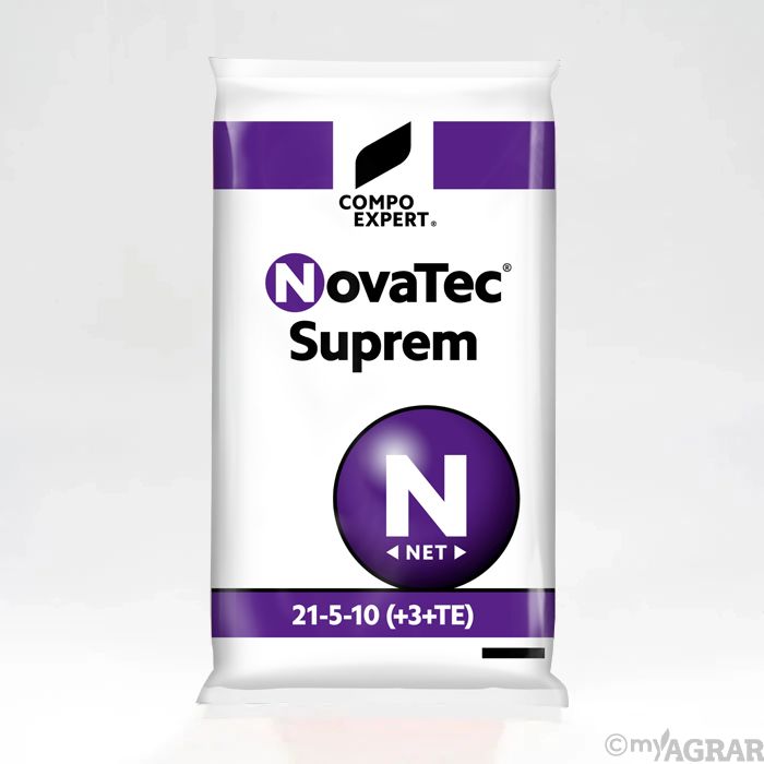 NovaTec Suprem ist ein NPK-Dünger mit Magnesium und Schwefel sowie dem Nitrifikationshemmstoff DMPP (3,4-Dimethyl-1H-pyrazolphosphat) und Bor, Eisen und Zink. Es handelt sich um einen stabilisierten, stickstoffbetonten Spezial-Volldünger, welcher nach aktuellen Bedürfnissen mit hervorragenden Produkteigenschaften optimiert wurde. NovaTec Suprem, mit der Nitrogen-Efficient-Technology durch Ammomiumstabilisierung, dient der Erhöhung der Stickstoff-Effizienz. In Kombination mit einer anteiligen Ammoniumernährung führt dies zu besseren Erträgen und Qualitäten und stellt somit auch einen Vorteil für die Umwelt dar. Das Produkt ist vor allem dort geeignet, wo ein N-betonter Pflanzenbedarf vorliegt und eine gewisse Menge an Phosphat und Kali unterstützend appliziert werden soll. Dies ist besonders bei guten bis sehr guten P- und K-Bodengehalten oder bei Kopf- bzw. Nachdüngungen der Fall. Der hohe Eisen- und Magnesiumgehalt sorgt außerdem für eine gute Ausfärbung und Assimilation. Des weiteren dient die feine Granulierung einer optimalen Verteilung und einem schnellen Kornzerfall.
