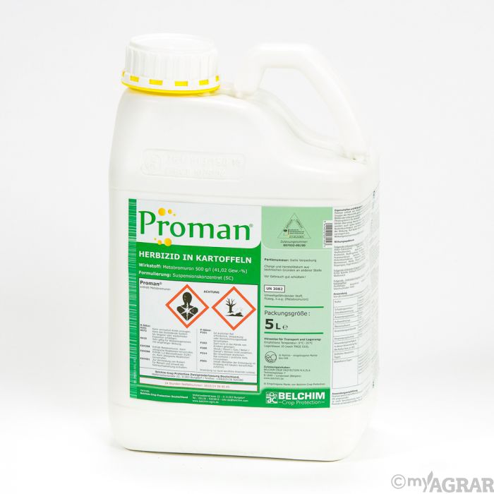Proman ist ein Herbizid gegen einjährige zweikeimblättrige Unkräuter, einjähriges Rispengras und Hühnerhirse in Kartoffeln. Der Wirkstoff bleibt über einige Wochen in der oberen Bodenschicht wirksam, somit werden auch später keimende Unkräuter erfasst. Eine ausreichende Bodenfeuchtigkeit und feinkrümelige Struktur des Bodens fördern die Wirkung.