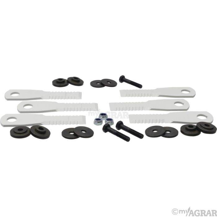 bestehend aus 3x Paddlemesser rechts, 3x Paddlemesser links, 6x Distanzbuchsen, 6x Scheiben, 3x Sechskantschraube, 3x Mutter selbstsichernd
