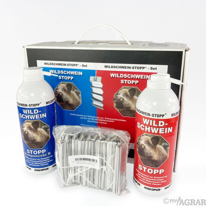 Wildschwein-Stopp Kombiset ist ein Vergrämungsmittel zur Reduzierung von Schwarzwildschäden im handlichen Kofferset. Durch eine Anwendung im Wechsel der Komponenten Wildschwein-Stopp blau und Wildschwein-Stopp rot wird eine Gewöhnung vermieden.